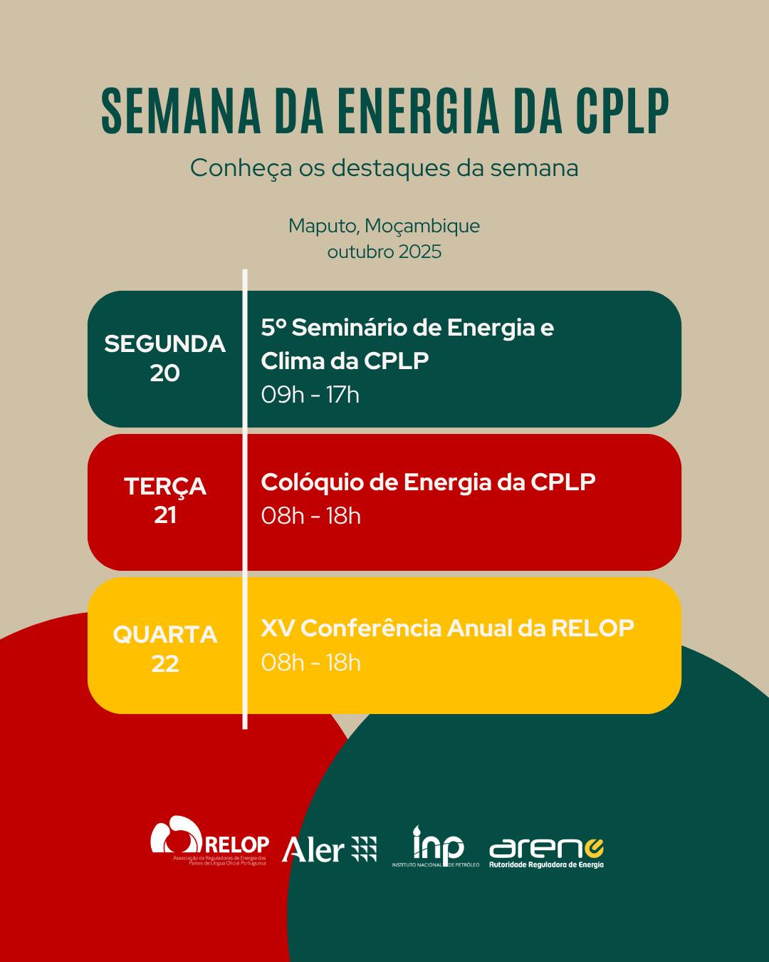 O evento insere-se na Semana de Energia da CPLP, que decorrerá entre os dias 20 e 24 de outubro de 2025, em Maputo, Moçambique. Esta Semana é organizada pela Comissão Temática de Energia e Clima dos Observadores Consultivos da CPLP, coordenada pela Associação Lusófona de Energias Renováveis (ALER), e subcoordenada pela Associação de Reguladores de Energia dos Países de Língua Oficial Portuguesa (RELOP).
